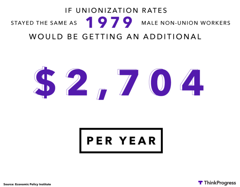 That’s hurt everyone’s wages, not just unionized workers. The wage-boosting power of unions usually spills out into other workplaces because they set standards that everyone ends up adopting. A new report from the Economic Policy Institute found that for men working in the private sector who aren’t in a union, their weekly wages would be about 5 percent higher if union membership had stayed at the same rate as it was in 1979. That would mean an extra $2,704 per year on average. Non-union women would also benefit, but the impact would be smaller — a 2 to 3 percent increase in wages — because women have historically been a much smaller share of union workers.