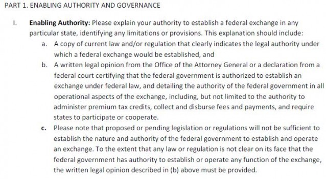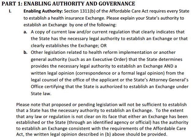 In 2011, as states were deciding whether to set up their own exchange or to have the federal government operate an exchange for them, HHS produced a draft “Application for Approval of an American Health Benefit Exchange,” which is formatted similarly to the states’ letter and which uses much of the same language as the satirical letter from the states. Here, for example, is a section of HHS’s draft application: