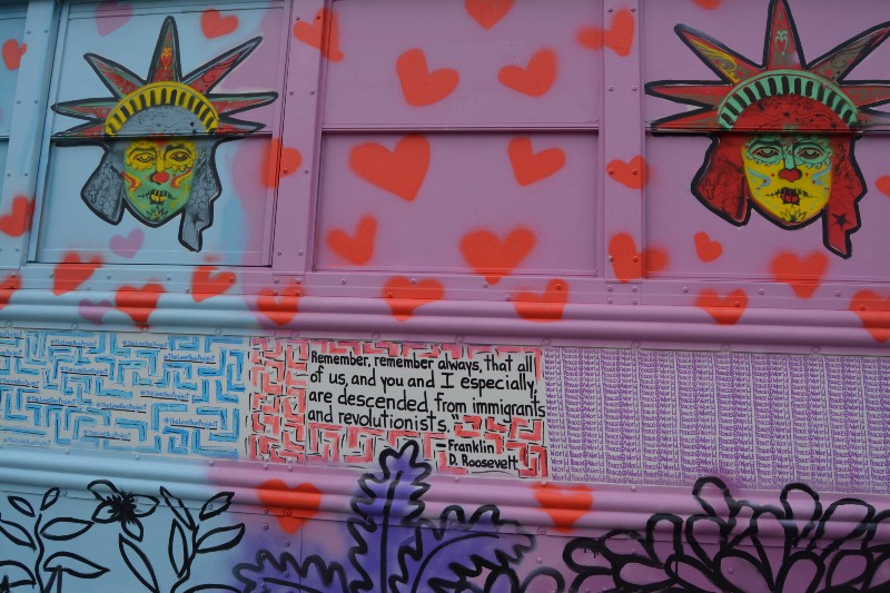 “The campaign has had a negative message and we wanted to offer something different to people,” Ruth Moreno, regional coordinator for iAmerica Action, told ThinkProgress on board The Love Bus. “Miami is big on art, big on culture, big on merging the two… so we thought, why not get a school bus and commission Miami-based artists to paint it to take that message of unity and solidarity and community to the streets.”