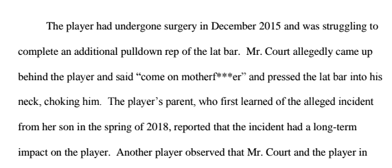 It also says Court “challeng[ed] a player’s manhood and hurl[ed] homophobic slurs” and “would attempt to humiliate players in front of their teammates by throwing food, weights, and on one occasion a trash can full of vomit.”