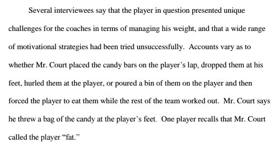 In another incident, Court forced a player with weight problems to eat candy in front of his teammates while the rest of them worked out.
