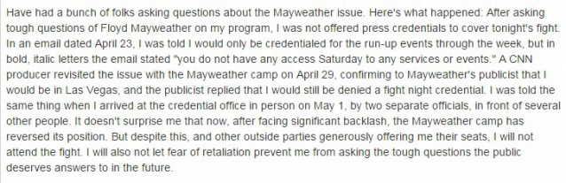 No fight for me or @MichelleDBeadle. Mayweather's team told my producer the camp was blocking my credential. https://t.co/JTjjXadPp8
