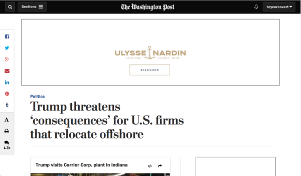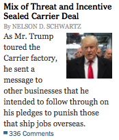 At the Washington Post, the headline focused on Trump promising vague “consequences” for companies that move production to other countries, while the body referenced his “determination to use a mixture of incentives and tariffs to keep jobs from going overseas,” despite the fact that no tariffs against United Technologies have been brought up in negotiations. The Wall Street Journal pointed to “penalties” in its headline and described Trump as using “a carrot-and-stick approach.” Both articles highlighted the parts of his speech that promised retribution, while leaving the parts of those sentences out where Trump promised to give them benefits.