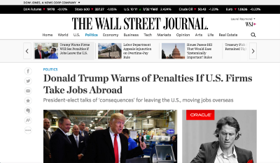 Yet the day after his speech, prominent media outlets ran with headlines saying that Trump is threatening to crack down on companies that move production offshore. They focused on his threat of “consequences,” despite the deal he actually struck with Carrier that includes no such consequences and despite other parts of his speech where he promised benefits to companies that threaten to leave.