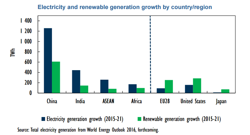 IEA’s Medium-Term Renewable Market Report shows that the United States is adding renewables at a faster rate than demand is growing — which means that renewables are not only covering the increase in demand, but also supplanting some fossil fuel electricity. Overall, though, wind and solar still only make up a small portion of the U.S.’s electricity.