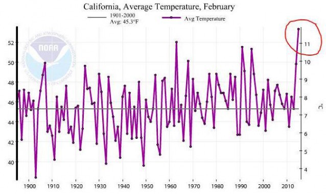 Also, as climatologist Peter Gleick noted on twitter, “California’s February temperatures blast[ed] through 120-year record. 8 degrees F above 20th [Century] avg.” As this NOAA data shows, last month the Golden State averaged a full 1°F higher than the second-warmest February on record: