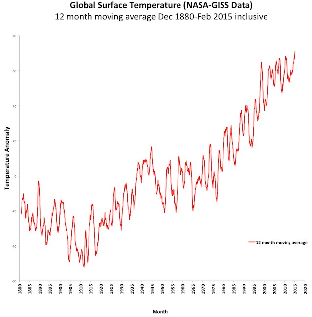 NASA reported this weekend that last month was the second-hottest February on record, which now makes March 2014–February 2015 the hottest 12 months on record. This is using a 12-month moving average, so we can “see the march of temperature change over time,” rather than just once every calendar year.