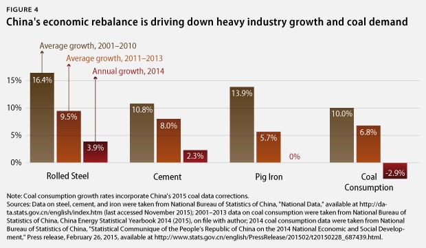 “In sector after sector, Beijing is working to downshift old growth engines and kick-start new ones,” Hart explains in her new report. “Many of the contracting industries — cement, steel, and iron — are some of China’s biggest coal consumers. As those industries contract, coal demand dries up and the coal sector shrinks as a result. Beijing is also intentionally ratcheting up coal prices to make those energy-intensive sectors less competitive, as well as to make coal less competitive vis-à-vis renewables.”