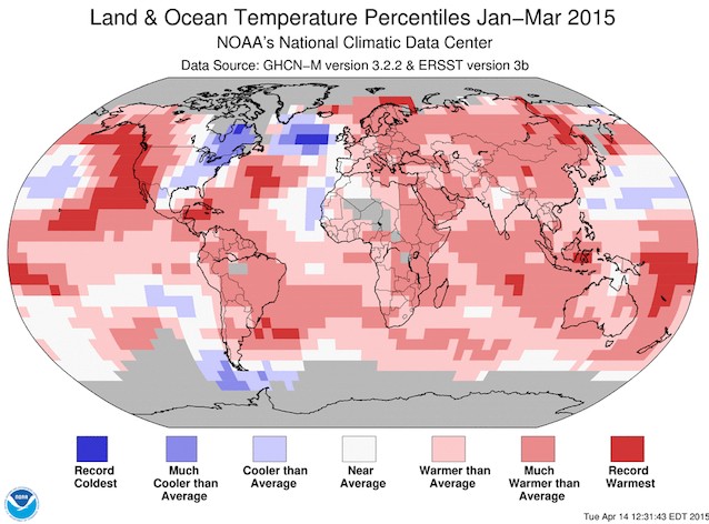 - March 2015 was not only the hottest March in their 135-year of keeping records, it beat “the previous record of 2010 by 0.09°F (0.05°C).”