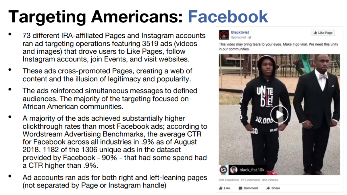 Researchers discovered that the “greatest effort on Facebook and Instagram” was devoted toward African-American audiences, and “substantial portions of the political content was anti-Hillary Clinton on both the right and left-leaning pages,” as the report’s slide deck read.