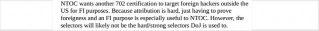 The N.S.A. wants expanded power to target foreign hackers when attribution is hard; would not be hard/strong selectors.