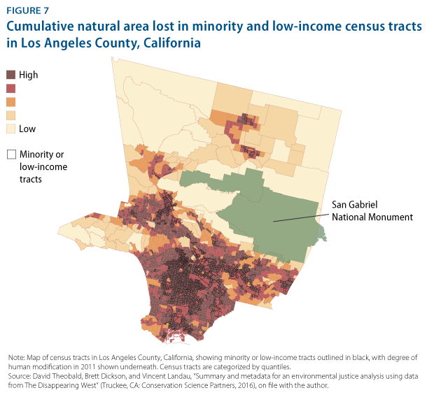 The environmental justice analysis done by Conservation Science Partners in conjunction with Center for American Progress used GIS analysis of data from the Census Bureau and the Disappearing West, a project that mapped the human footprint in the West. The study finds that nearly 84 percent of communities of color and 80 percent of low income communities in the West live in areas where the amount of natural area is less than the state average, compared with just under 60 percent of non-minority and 61 percent of non-low-income tracts.