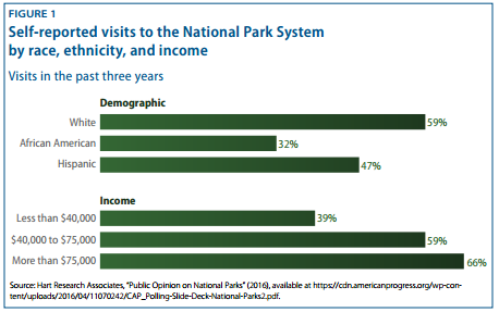 A January 2016 Hart Research Associates poll found similar disparities between those in different economic circumstances. According to the poll, 39 percent of Americans with annual incomes below $40,000 reported visiting a national park in the past three years. However, that number shoots up to 59 percent and 66 percent for those with incomes from $40,000 to $75,000 and over $75,000, respectively.