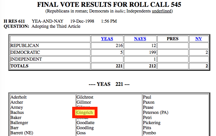 Here is the official vote tally. On December 19 at 1:56PM, Gingrich voted to impeach President Clinton for obstruction of justice.