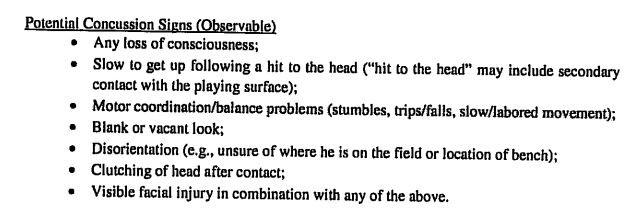 According to the concussion checklist on the NFL Health & Safety website, if any of these three parties notice that “a player exhibits or reports signs or symptoms of concussion on the field, without exception, he is to be removed immediately from the field of play and evaluated by the Club medical team, pursuant to the Protocols. This evaluation shall include a locker room examination utilizing the complete NFL Sideline Concussion Assessment Tool, where necessary.”