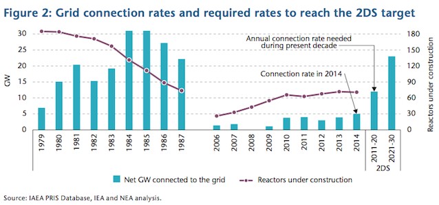 In 2014, just 5 gigawatts of capacity were added. In their “Nuclear Roadmap,” the IEA and NEA explain what level of capacity additions would be required in its 2 degrees Celsius scenario: “In order for nuclear to reach its deployment targets under the 2D scenario, annual connection rates should increase from 5 GW in 2014 to well over 20 GW during the coming decade.” That means returning to a nuclear build rate previously achieved for only one decade — 20 gigawatts per year during the 1980s. That target has many challenges in a post-Fukushima world.