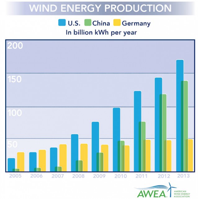Did you know, as Obama said, that “America is number one in wind power”? It’s true — if instead of going by installed capacity you go by “the total amount of electricity, measured in kilowatt-hours (kWh), that each country produces from wind and delivers to customers each year,” according to statistics from the American Wind Energy Association (AWEA).