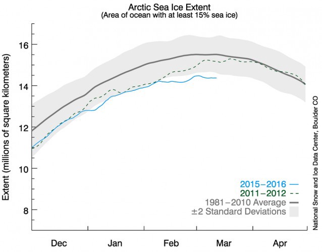 It was so hot last month that large parts of the Arctic averaged more than 18°F (10°C) above normal. Not only did last month easily set the record for lowest February Arctic sea ice extent, as the National Snow and Ice Data Center (NSIDC) reported, but Arctic sea ice growth has been almost flat for over a month during a time when it normally soars to its annual maximum.