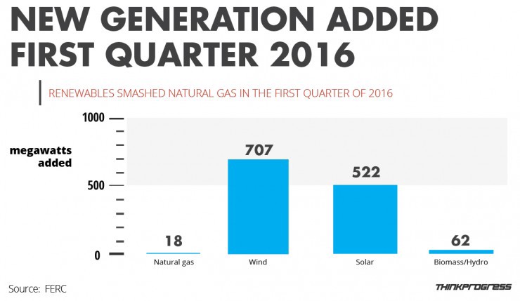 In the first three months of 2016, the U.S. grid added 18 megawatts of new natural gas generating capacity. It added a whopping 1,291 megawatts (MW) of new renewables.