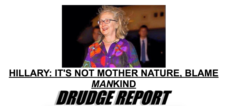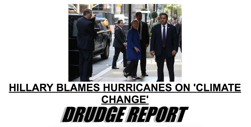 Later Thursday night, Drudge’s site changed its banner headline from denying the intensity of Hurricane Matthew to denying the reality of climate change. The headline says “Hillary blames hurricanes on ‘climate change’” and links to a month-old post on a climate denier blog, written by Marc Morano — himself known as “the Matt Drudge of climate denial.”