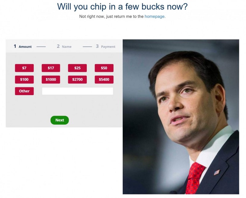 Readers are directed to enter their information if they “Agree with Marco.” As soon as you enter the information, you get a fundraising pitch soliciting contributions of up to $5400.