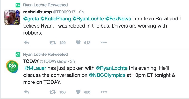 But while Lochte’s idiocy and pompousness are definitely factors here, his handling of this incident from start to finish was nothing short of shameful and calculating. He knew there was already a spotlight on violence in Rio, and he stroked that for sympathy. He knew that the media was going to be interested in this, so he soaked up every bit of attention. When he arrived back in the United States earlier this week before the scandal really blew up, he took to Twitter highlight other incidents of violence in Rio and promoted his Today Show appearances. (After tweeting about his hair, of course.)