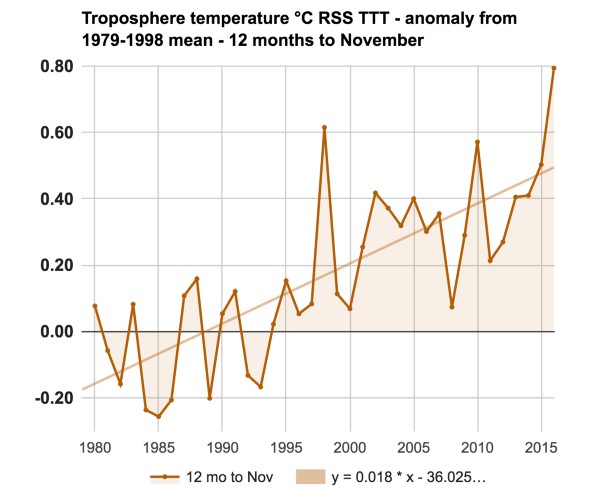 Here is the latest data from the RSS satellites. (These are the satellites some climate deniers love to quote, because their data contain errors that low-ball total warming.) This chart looks at every 12-month period ending in November. It starts with December 1979 to November 1980 and ends with December 2015 to November 2016. These data show that not only is November 2016 the hottest on record, but there is an ongoing, annual trend.