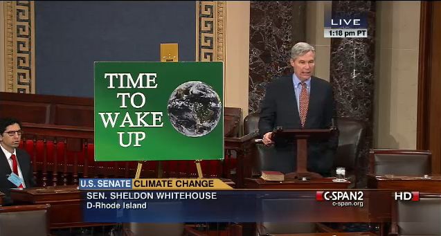 On Monday, Whitehouse will give his 100th floor speech on climate change. As Agence France-Presse reports, Whitehouse usually gives these speeches to an empty or near-empty room, accompanied by a green sign warning his colleagues that it’s “Time To Wake Up.”