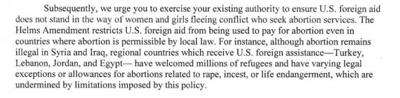 “Although the Helms Amendment prevents U.S. foreign aid from being used to perform abortions for family planning purposes,” they wrote, “for over 40 years it has been incorrectly interpreted to prevent the use of foreign aid to fund safe abortions even in the cases of rape, incest, or life endangerment.”