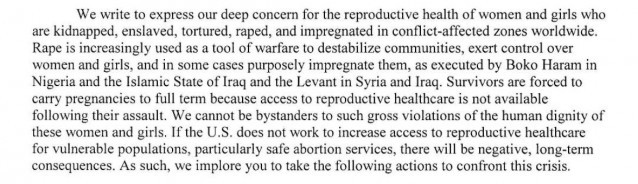 The senators have urged the president to expand access to abortion services, especially as rape is being used as a deliberate tactic of control for many militant groups. They said that the U.S. could help women receive access to abortion services in countries where they are legal. Their letter continued: