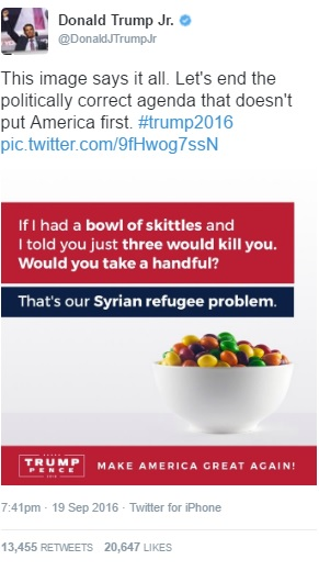 Donald Trump Jr., the son of Republican presidential candidate Donald Trump, tweeted a photo on Monday likening a bowl of poisoned Skittles to refugees that quickly went viral thanks to the inaccurate and dehumanizing comparison.