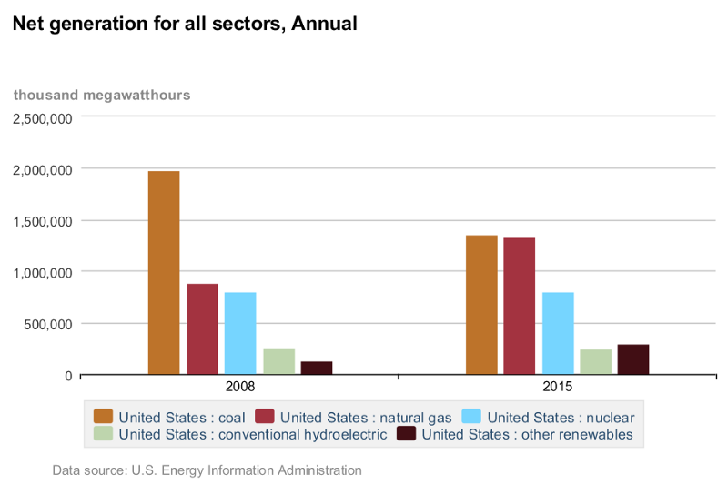In 2015, coal and natural gas each accounted for about a third of electricity generation.