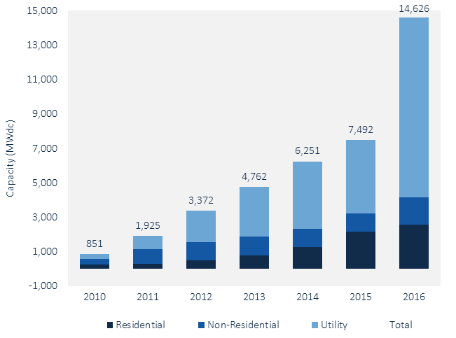 All segments — residential, non-residential, and utility-scale — saw growth from 2015 to 2016.