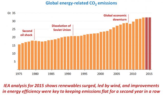 The International Energy Agency has confirmed that global carbon dioxide emissions have decoupled from economic growth. The IEA reports that for the second year in a row, the world economy has grown while energy-related CO2 emissions — the primary cause of climate change — remained flat, thanks to energy efficiency and a big surge in renewables.