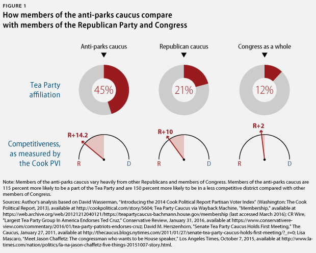 The CAP analysis indicates that the far right flank of the Republican party has been a driving force behind the emergence of the caucus. While Tea Party affiliation only comprises 12 percent of Congress as a whole, it makes up 45 percent of the anti-parks caucus. Furthermore, every member of the anti-parks caucus can be described in at least one of the following ways: is member of the Tea Party; was challenged by a Tea Party candidate in a recent primary; or represents a district that is less competitive than average.
