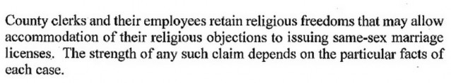 Paxton says whether a clerk could legally refuse “depends on the particular facts of each case.” He provides no guidence as to what facts would justify a refusal. He also acknowledges that his opinion could result in a same-sex couple being unable to obtain a marriage license in Texas. “[I]t is conceivable that an applicant for a same-sex marriage license may claim a violation of the constitution,” Paxton writes.