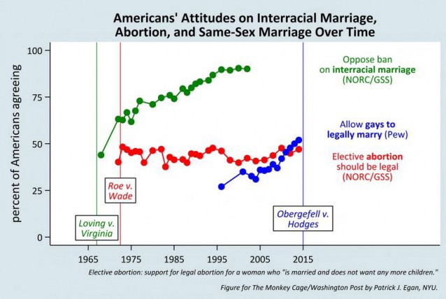 The fact that support for marriage equality continues to surge in a parallel way to interracial marriage contradicts Roberts’ concern on two fronts. First, it suggests that the Court is behind the times because public support is already so high even though the justices haven’t gotten around to addressing the fundamental question. Secondly, it suggests that Obergefell could have the same impact as Loving, further increasing support as marriage equality becomes the status quo. And, as Egan also pointed out, all of this polling information demonstrates how same-sex marriage is in no way comparable to abortion, which is a very different issue, one with existential questions that might never enjoy consensus.