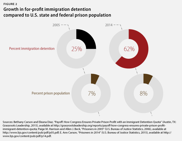 That’s far more than the share of state and federal prisoners held in private prisons. It’s clear that the rise of privatized immigration facilities has been a huge boon to the industry: