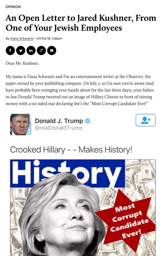 His involvement in Trump’s campaign is rankling some of the Observer’s reporters. This afternoon, Dana Schwartz published an “open letter” to Kushner for not speaking out about an anti-Semitic image Trump tweeted over the weekend. (The image was originally created by a white supremacist.)