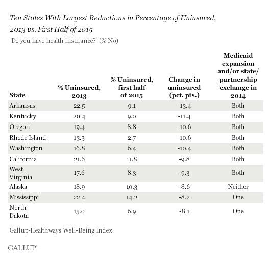 On Monday, Gallup released the latest data on the uninsured rate, finding that the states that embraced Obamacare have seen the largest drops in the number of residents going without health care. Essentially, the 22 states that have worked to implement both major provisions of the law — including setting up a state-level insurance marketplace and expanding the eligibility requirements for Medicaid — have seen their uninsured rates drop by an average of 7.1 points, about two points more than the remaining states that have not taken both steps. In some states, the uninsured rate has declined by more than 10 percentage points.