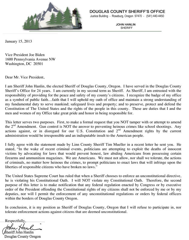 Douglas County Sheriff John Hanlin, who is overseeing much of the law enforcement response to Thursday’s tragic shooting at Umpqua Community College, believes some highly unusual things about gun rights and the Constitution. Two years ago, when Vice President Joe Biden was spearheading the Obama administration’s response to the Sandy Hook school shooting, Hanlin wrote Biden threatening open defiance of federal efforts to enforce gun laws. The letter is also riddled with language commonly used by the “Oath Keepers,” a right-wing veterans and law enforcement group that is closely associated with armed, anti-government militias.