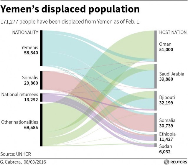 Yemen’s war has displaced around 2.4 million Yemenis according to UNHCR, most of whom are internally displaced. A further 170,000 people have fled the country, though most are foreigners. Instead of heading to Europe though, Yemenis are going to Djibouti, Somalia, Sudan, and Ethiopia, Reuters reports. Many have also fled to neighboring Oman and some even to Saudi Arabia, the country that is bombing them.