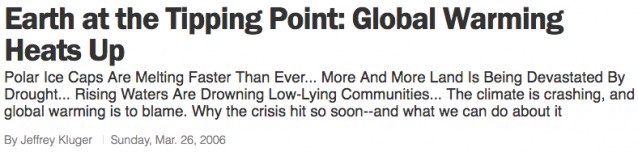 How quaintly optimistic that sounds today. Again, Time got the science right: In the past decade, glaciers in Antarctica and Greenland have been moving much faster than the vast majority of scientists ever imagined. We are frighteningly close to the point of irreversible disintegration of both of the Greenland and West Antarctic ice sheets.
