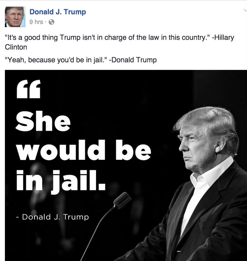 Her interpretation, however, is belied by Trump’s own Facebook page. He published a post embracing his threat shortly after Monday night’s debate ended: