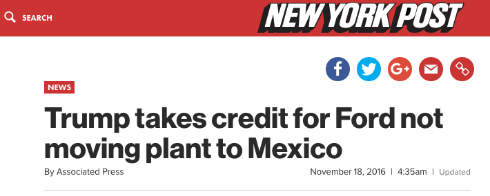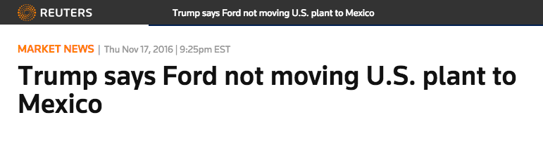 And yet despite Trump’s Twitter victory lap over the relatively inconsequential concession, Ford confirmed to Reuters on Tuesday that the company will be moving ahead with plans to move small car production to Mexico by 2019, regardless of Trump’s election.