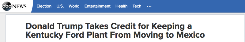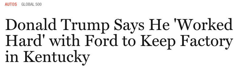 President-elect Donald Trump fired off two tweets on Thursday bragging about having saved American jobs. A Ford plant in Kentucky that was planning to move to Mexico, he alleged, was now going to stay in Kentucky because of his election.