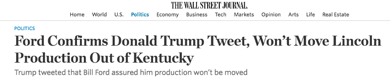 According to follow-up reporting by the Wall Street Journal on Friday, the decision to keep the Lincoln production in the US is indeed a response to Trump’s election: “Executives see the Lincoln move as a relatively painless but authentic way to give Mr. Trump a victory even before he moves into the White House.”