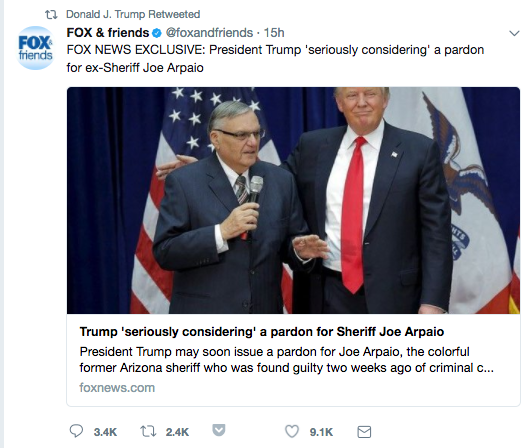Both the tweet containing the image of the train striking the CNN journalist and the one calling him a fascist were replies to yet another tweet Trump retweeted — a Fox News report about how he’s considering a pardon for ex-Sheriff Joe Arpaio, who, as the reports details, “was found guilty two weeks ago of criminal contempt for defying a state judge’s order to stop traffic patrols targeting suspected undocumented immigrants.”