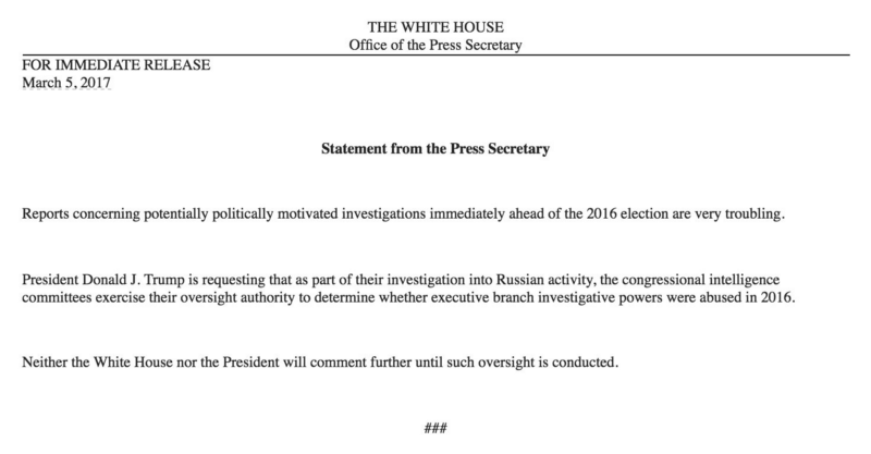 Sanders comments came as White House Press Secretary Sean Spicer tweeted the White House was calling for an investigation and that “neither the White House nor the President will comment further until such oversight is conducted.”