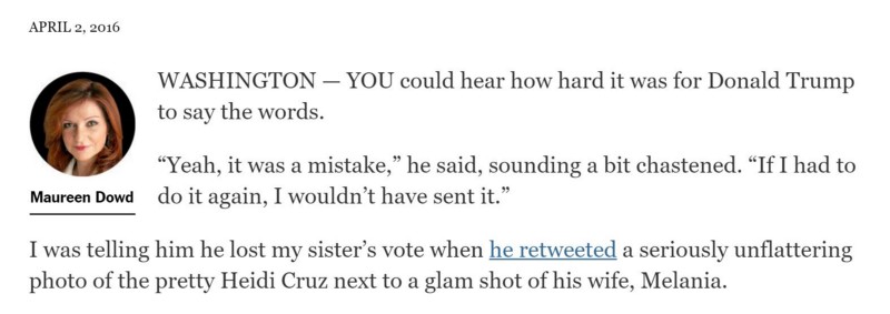 In March, Trump retweeted an unflattering picture of Ted Cruz’s wife, Heidi Cruz. It was a nasty tweet that seemed to serve no particular purpose.